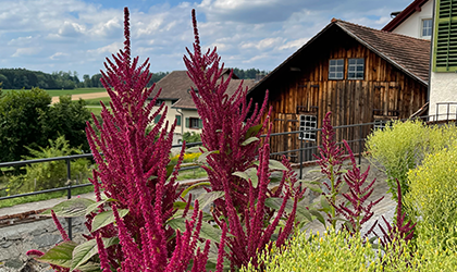 In unserem Garten wachsen 15 verschiedene Salat-, über 25 Gemüse- und mehr als 45 Tomatensorten. Ausserdem bauen wir Teekräuter, diverse Blüten und verschiedene Sorten Sommerflor an.
