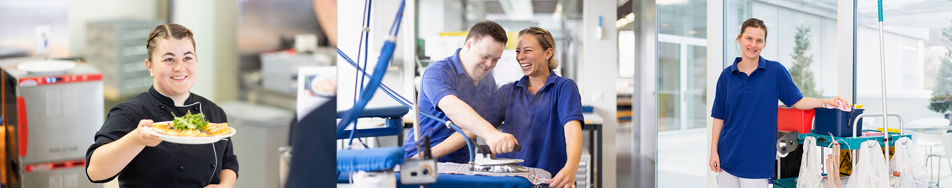 Bei uns und unserem Partnerbetrieb bekommst du spannende Einblicke in Bereiche wie Wäscherei, Reinigung, Küche und Rezeption. Gemeinsam mit Menschen mit Beeinträchtigungen sorgen wir dafür, dass alles reibungslos läuft und die Qualität stimmt. Mit deiner Arbeit unterstützt du nicht nur unsere Mitarbeitenden, sondern beeindruckst auch unsere externen Gäste. Bei uns steht der Mensch im Mittelpunkt und du hast die Chance, jeden Tag etwas Sinnvolles und Erfüllendes zu tun.